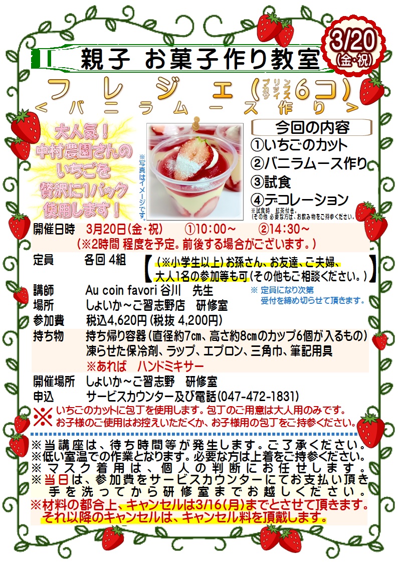 3/20(金・祝)「親子 お菓子作り教室」 フレジェ ※満席御礼! お申込み受付は終了いたしました