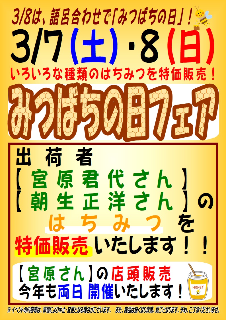 3/7(土)・8(日)の両日、「みつばちの日フェア」を行います。