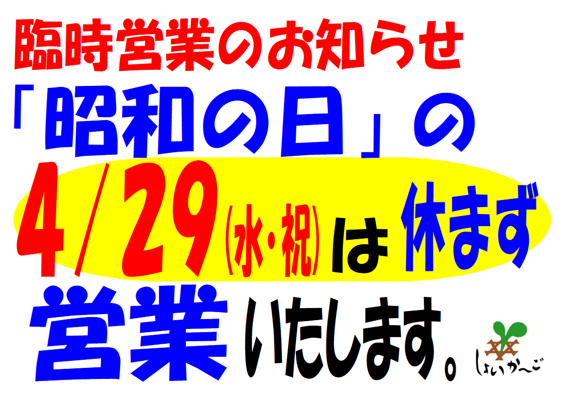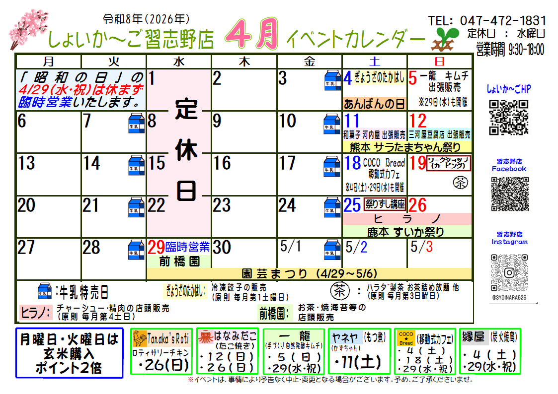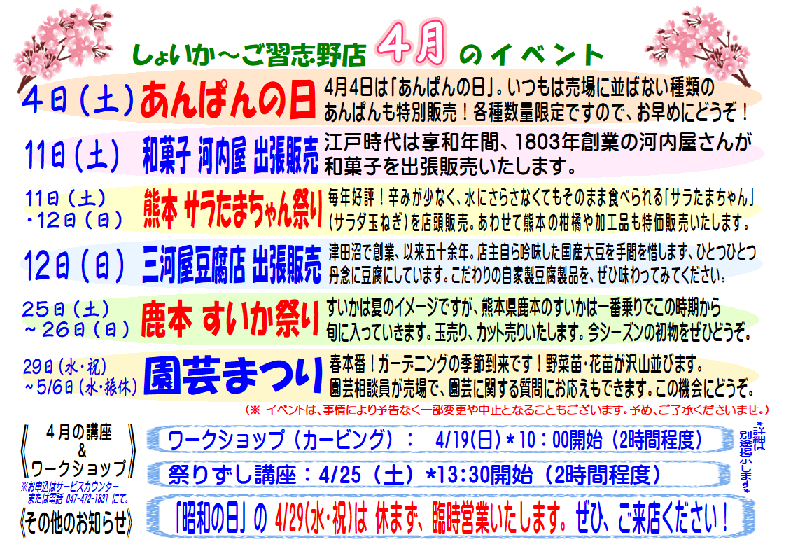 ☆4月のしょいか~ご習志野店情報☆ ※「昭和の日」の4/29(水・祝)は休まず、臨時営業いたします