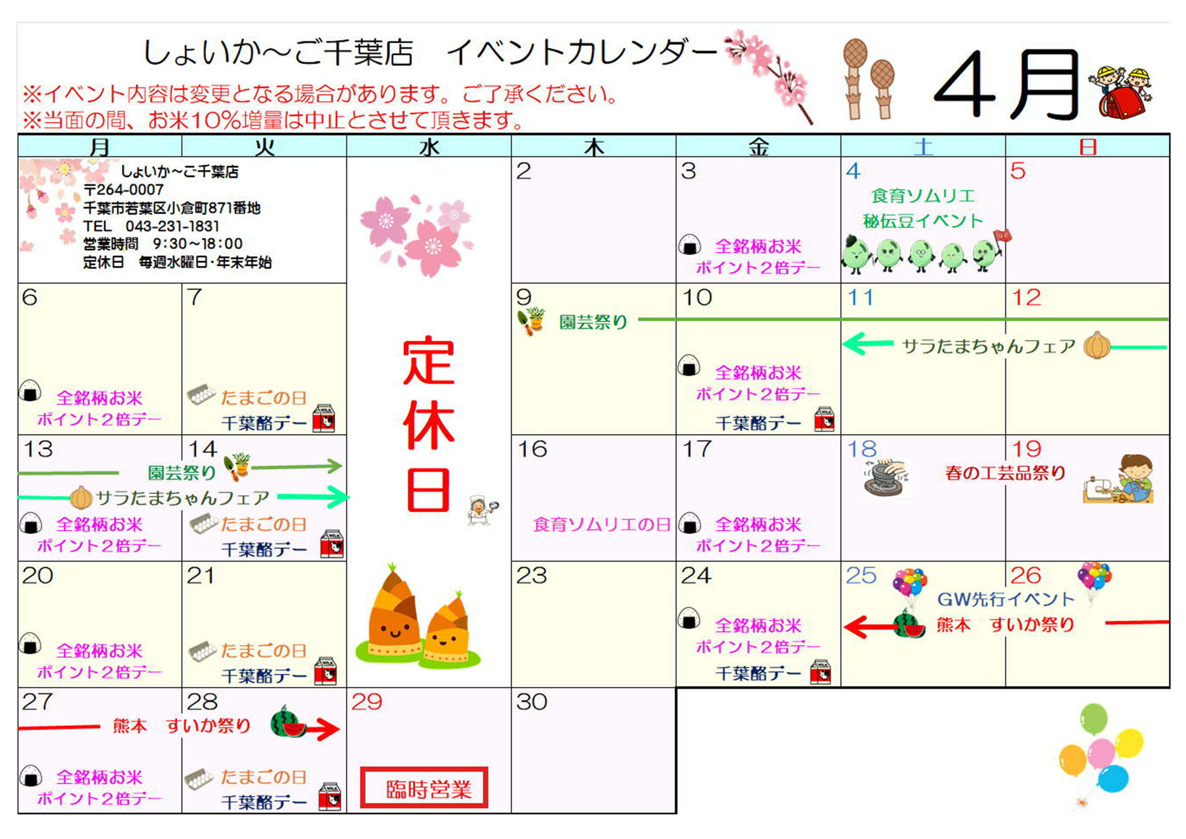 しょいか~ご千葉店4月のイベントカレンダーです!