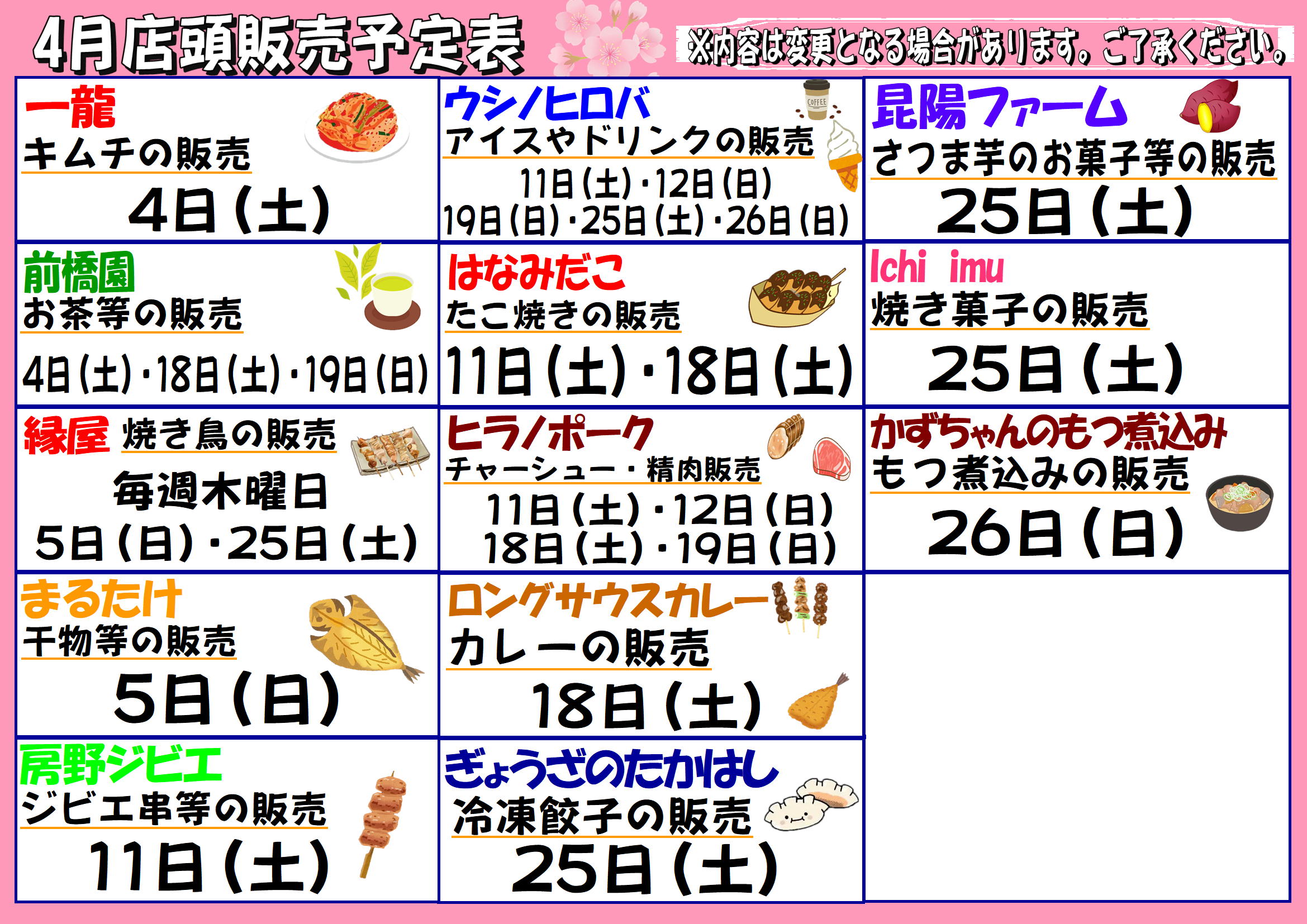 ・4月11日(土)に店頭販売を予定しておりました縁屋さんですが、都合により出店中止となりました。