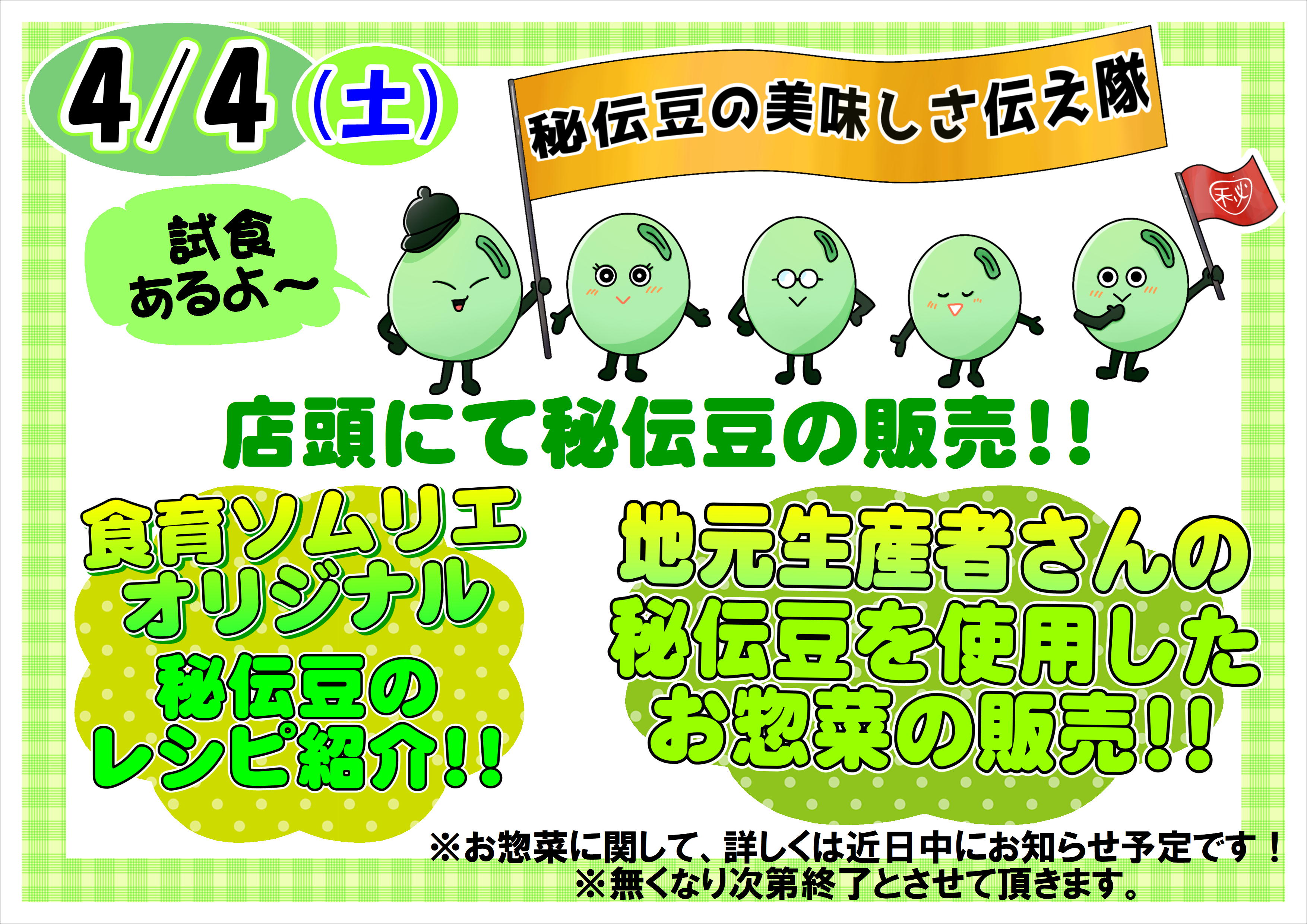 4月4日(土)食育ソムリエによりますイベント【秘伝豆の美味しさ伝え隊】の開催!