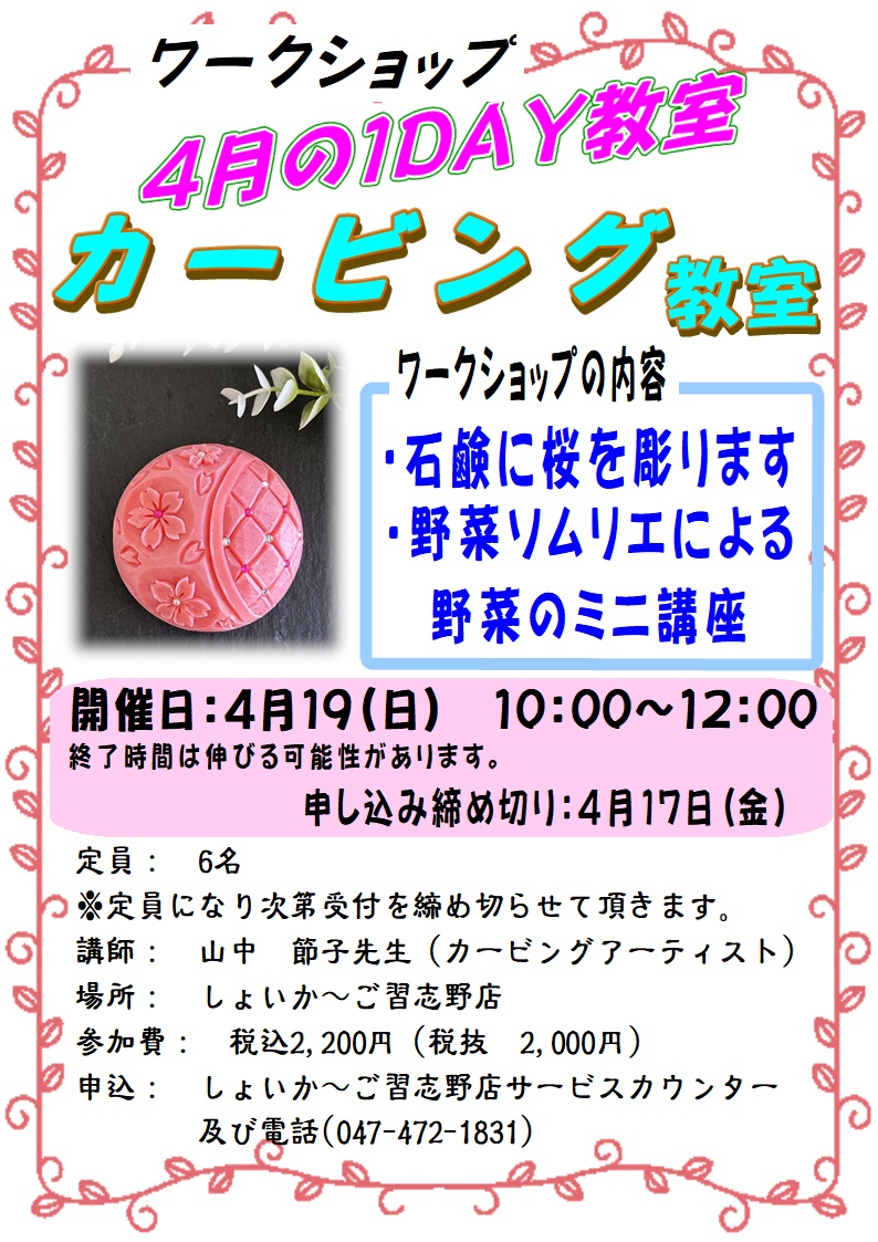 4/19(日)1DAYワークショップ :カービング 「石鹸カービング」