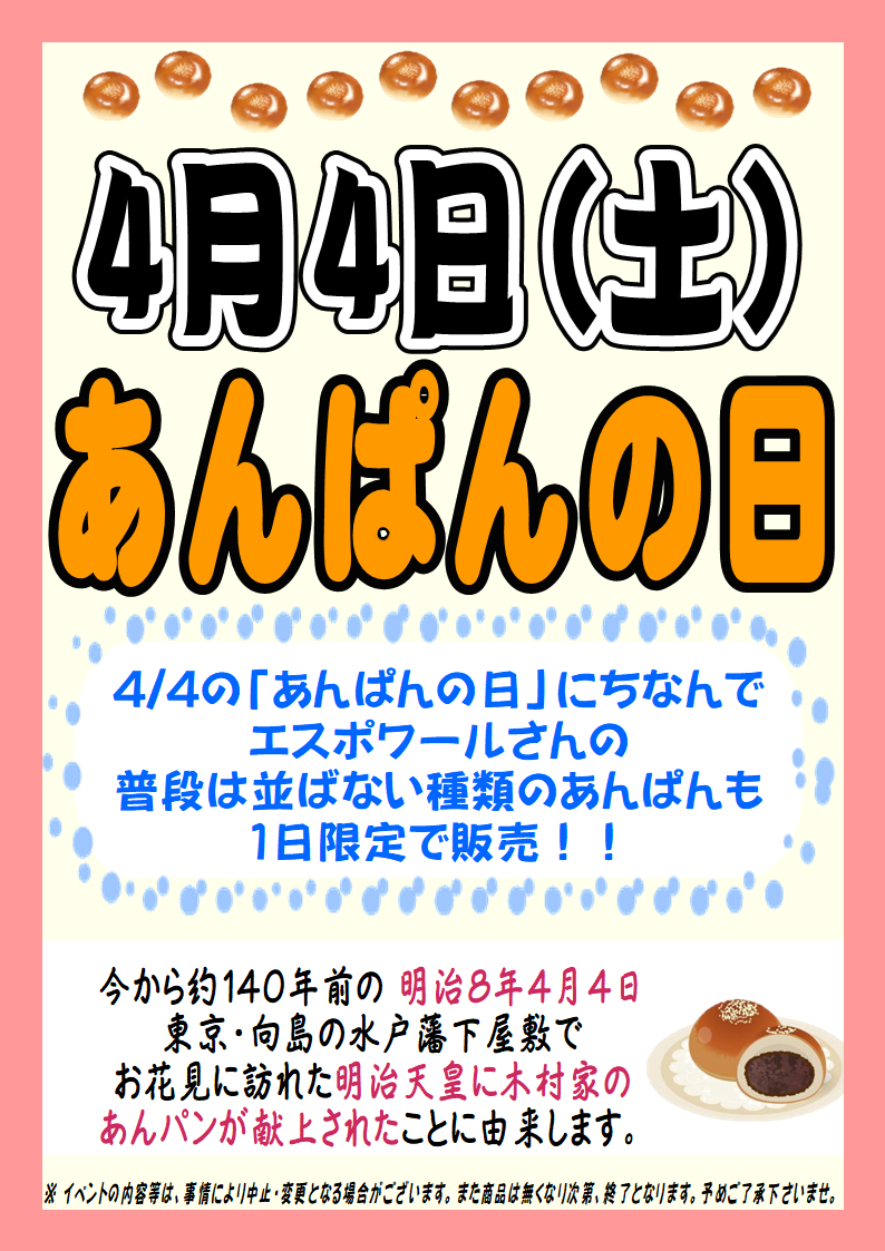 4/4(土)に「あんぱんの日イベント」を開催いたします。