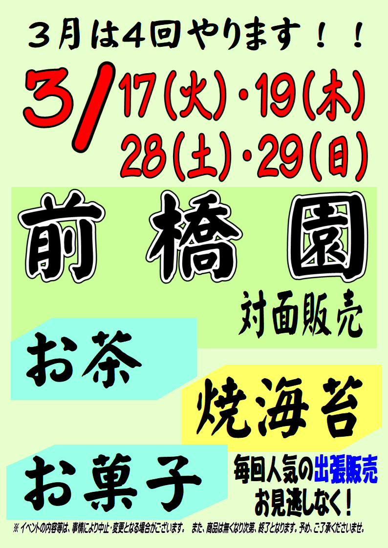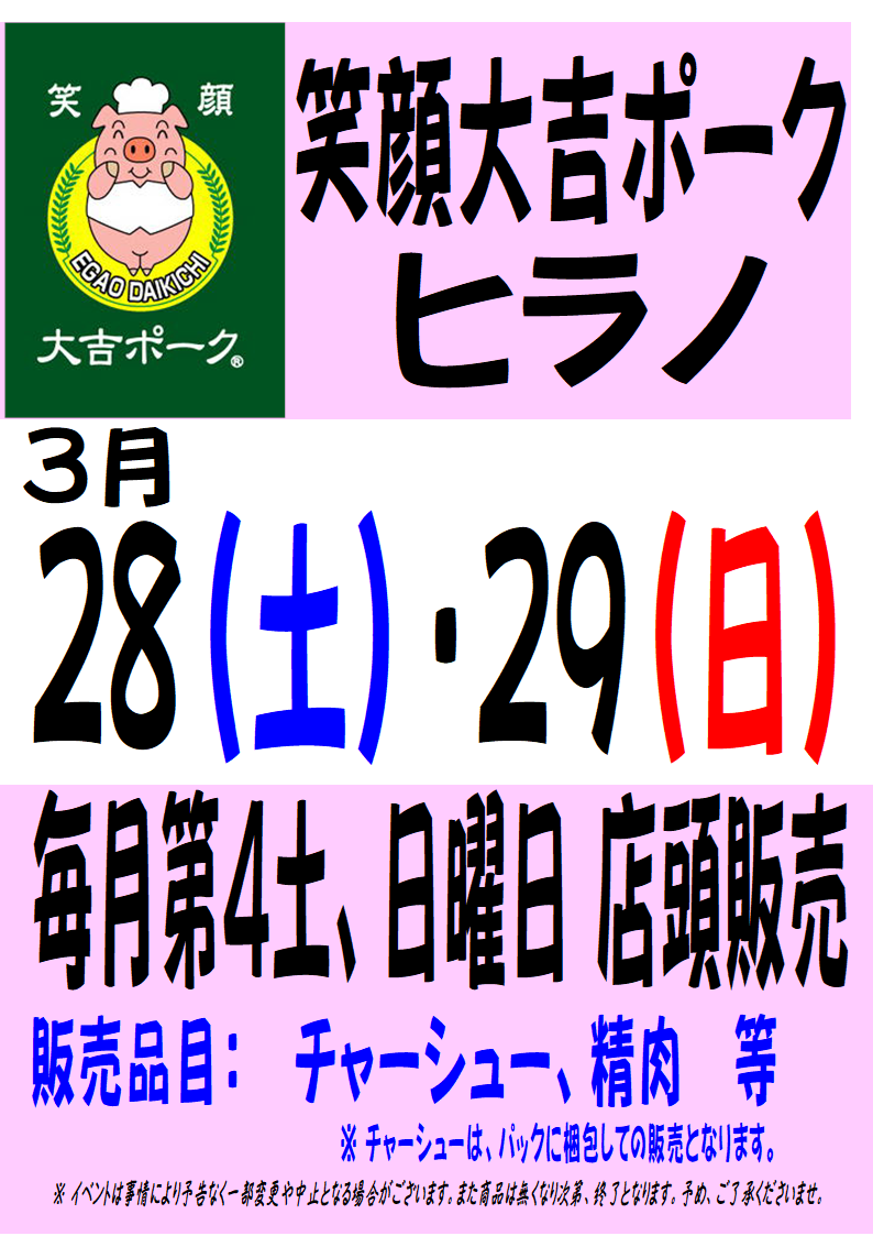 しょいか~ご習志野店では3/28(土)・29(日)に以下の店頭・出張販売を行います。