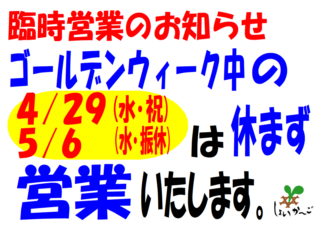ゴールデンウィーク期間中の4/29(水・祝)~5/6(水・振休)に