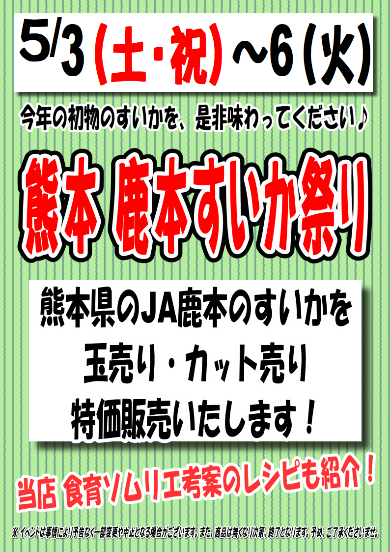 5/3(土・祝)~6(火・振休)の期間、「熊本 鹿本すいか祭り」を開催いたします。