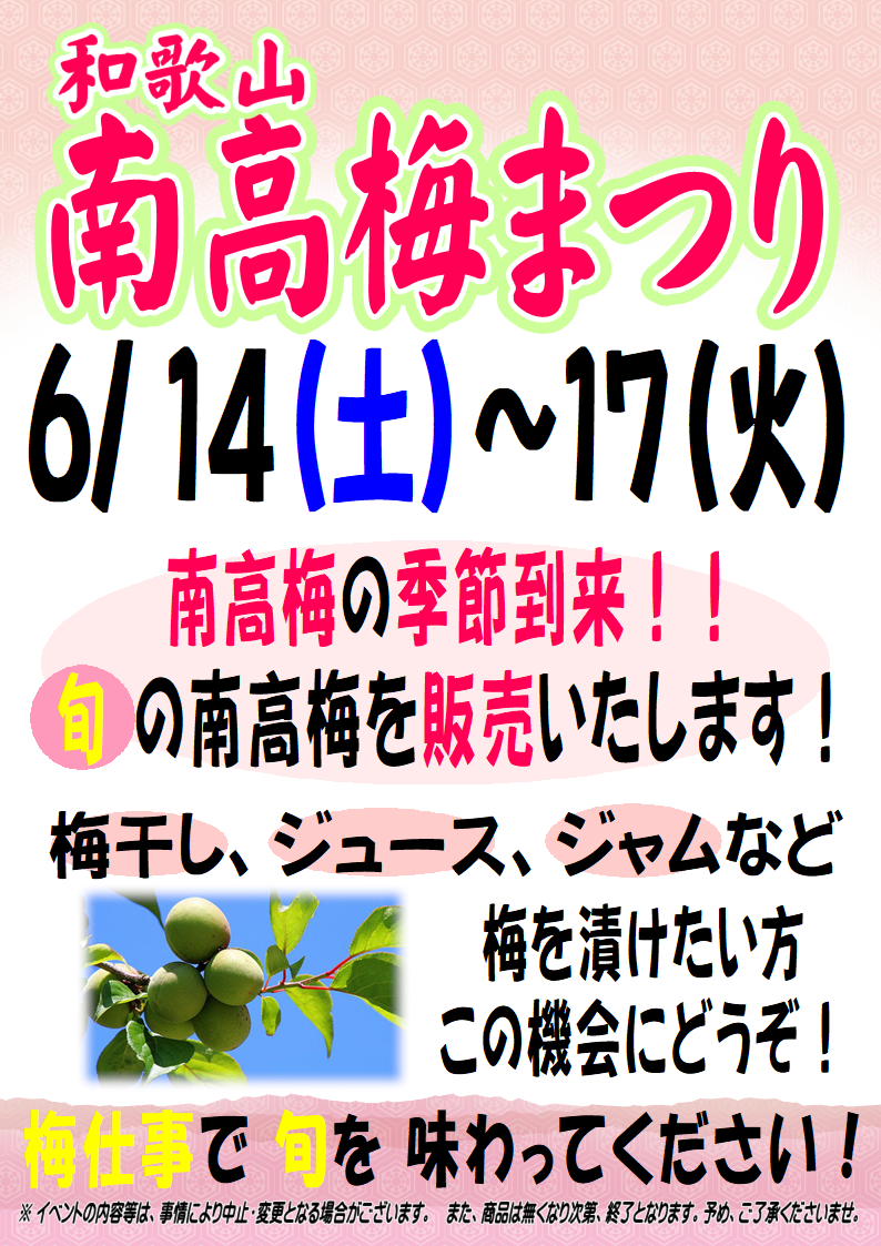 6/14(土)~17(火)の日程で「和歌山 南高梅まつり」を開催いたします。