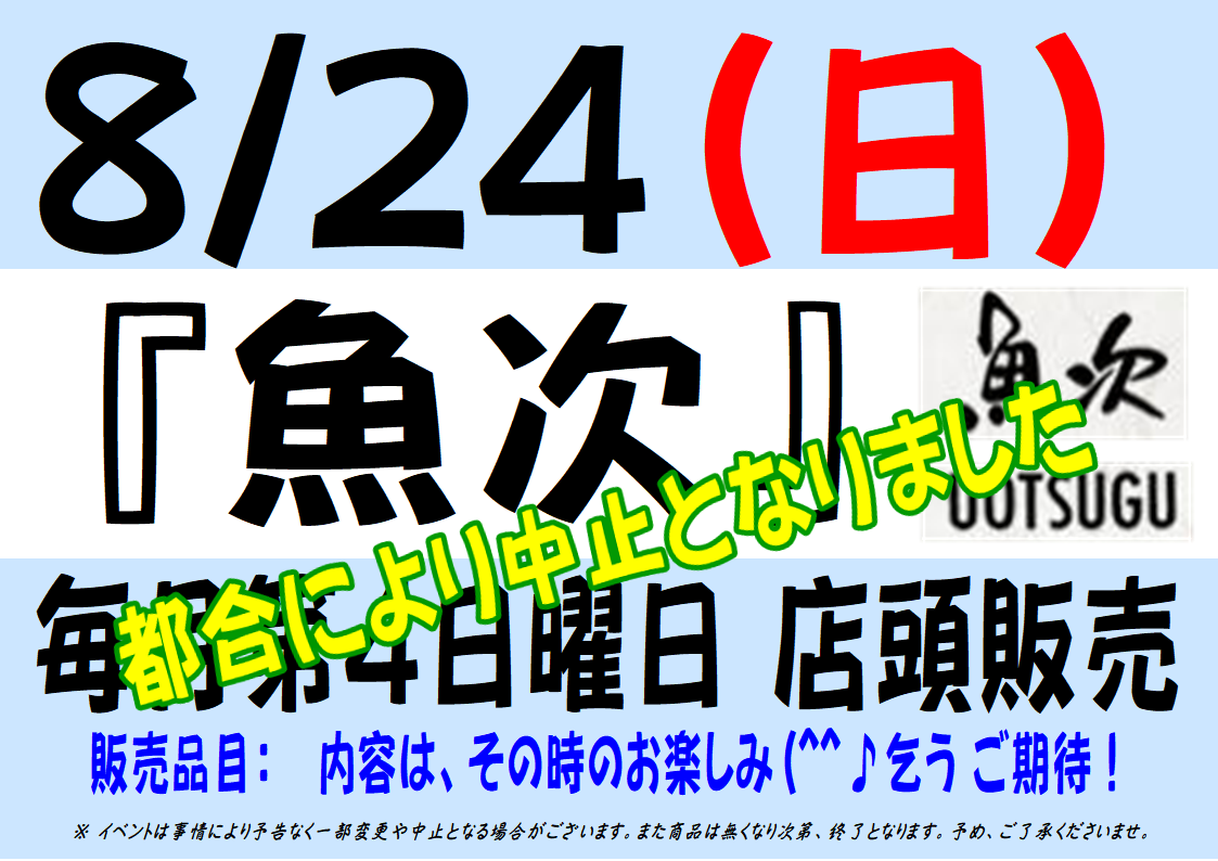 8/24(日) 「魚次」さん 店頭販売お休みのお知らせ