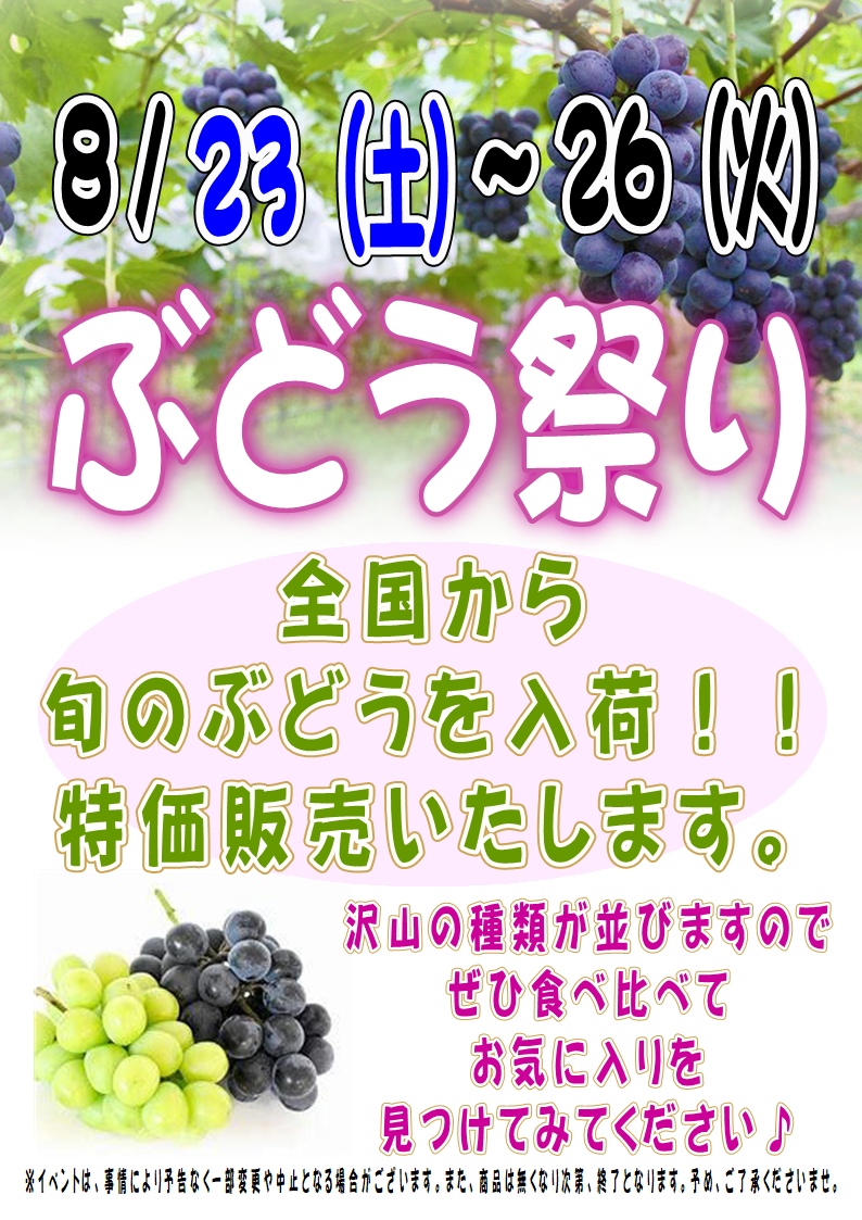 8/23(土)~26(火)「ぶどう祭り」& 8/23(土)・24(日)笑顔大吉ポークヒラノさんによる店頭販売