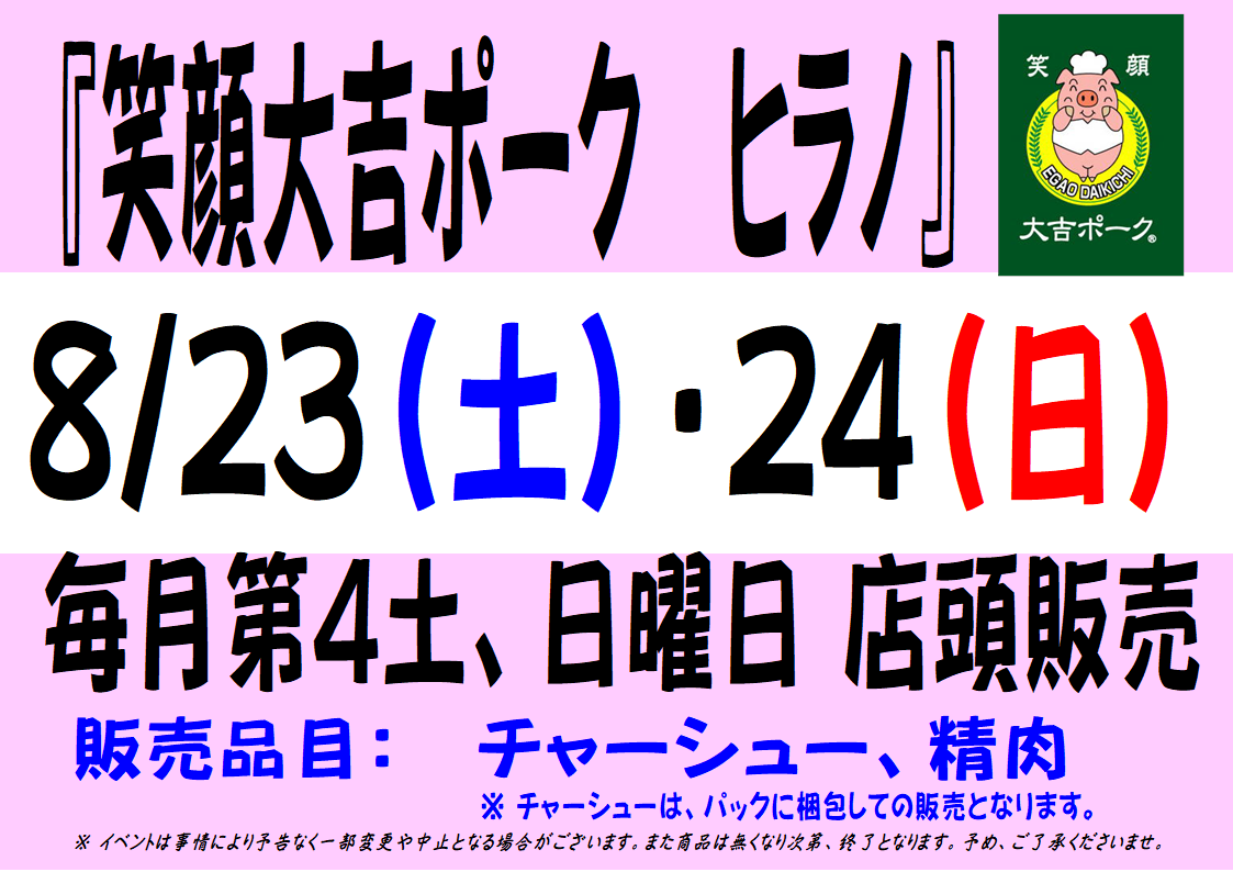 笑顔大吉ポークヒラノ」さんによる「チャーシュー&精肉の店頭販売」もございます。