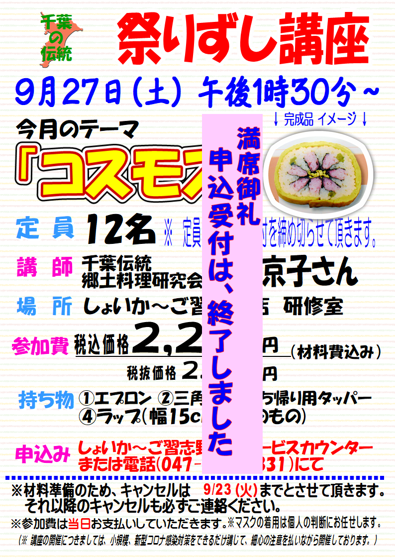 しょいか~ご習志野店では、9/27(土)に「祭りずし講座」を開催いたします。