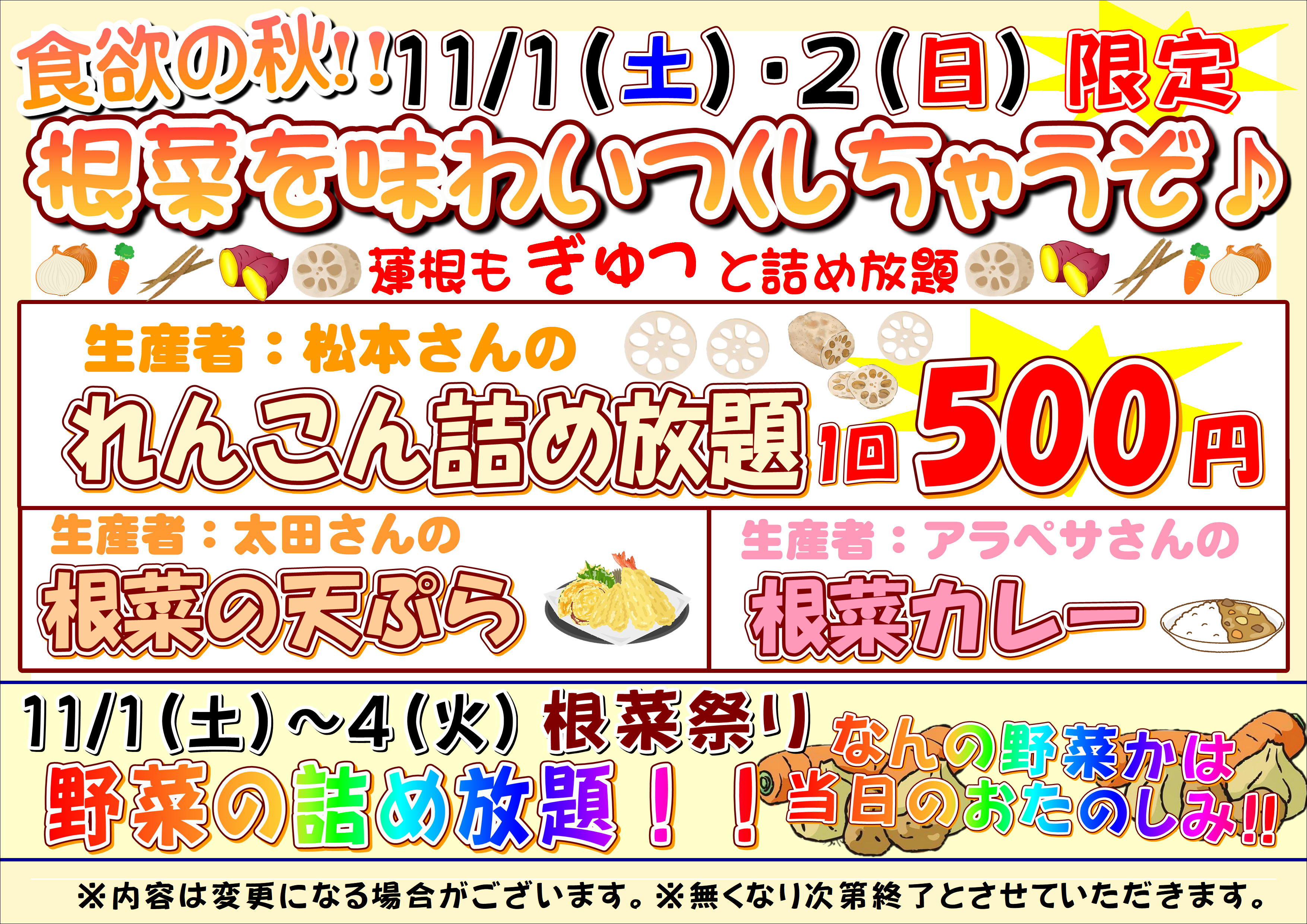 また、11月1日(土)~2日(日)は食育ソムリエによりますイベント「食欲の秋!!根菜を味わいつくしちゃうぞ♪」を開催!
