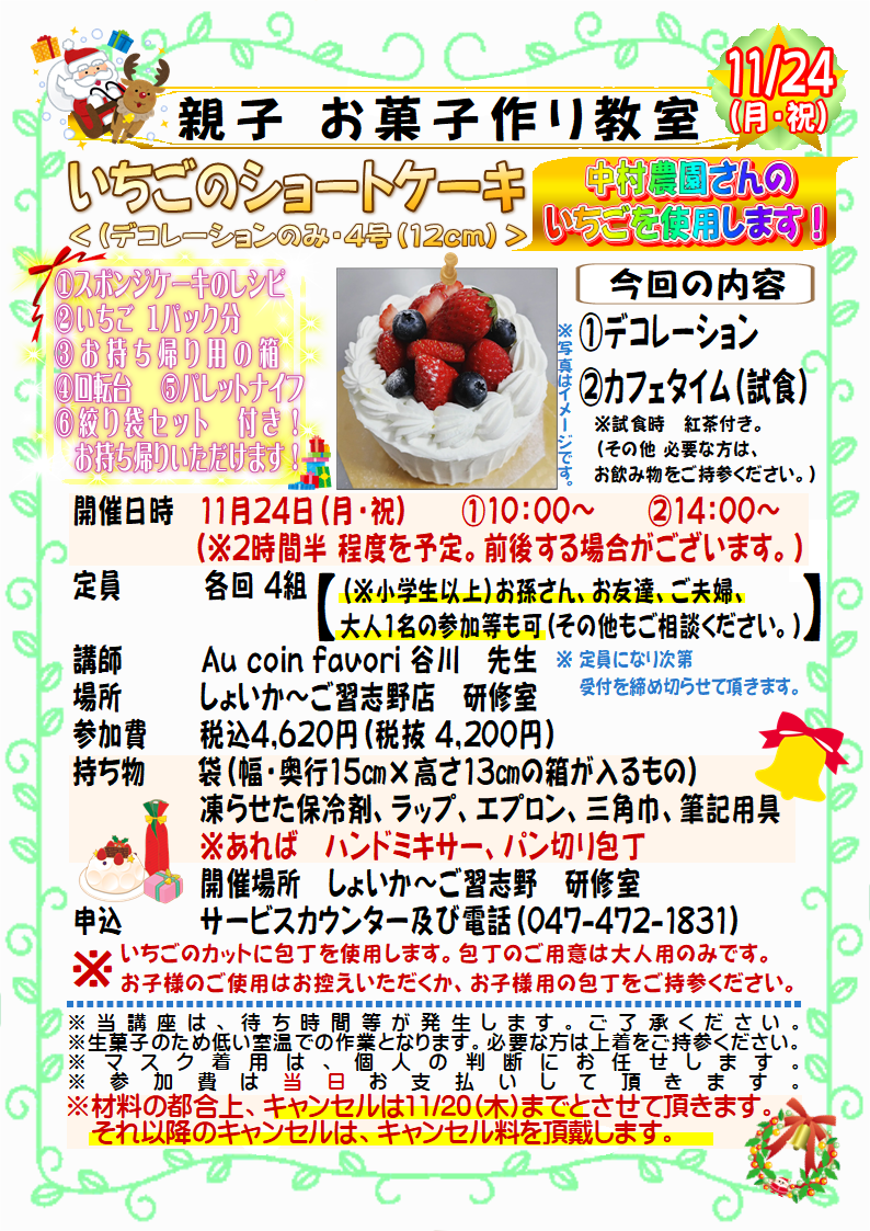 11/24(月祝) 「親子 お菓子作り教室」 いちごのショートケーキ(デコレーションのみ) *【満席御礼】本教室は申込受付を終了いたしました