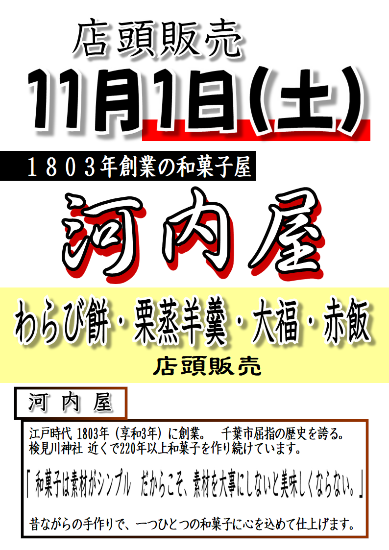 また、11/1(土)には検見川神社近くの「河内屋」さんによります、