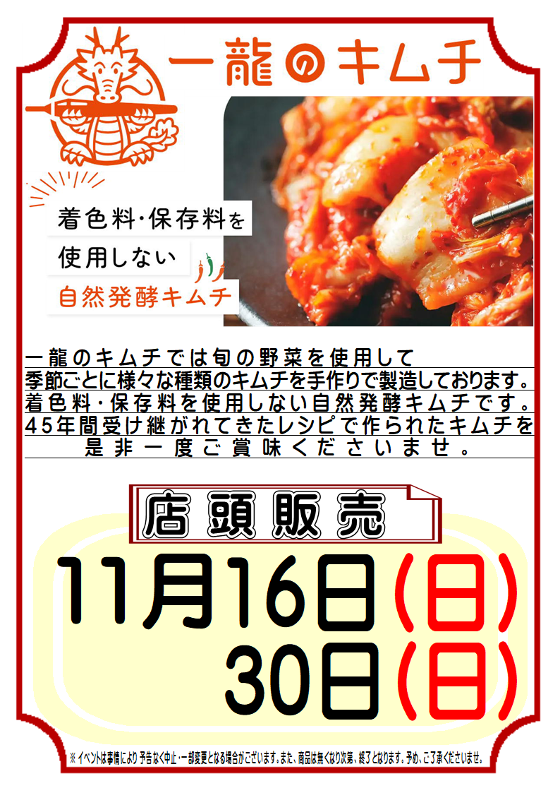 【初開催!】11/16(日)・30(日)「一龍のキムチ」店頭販売