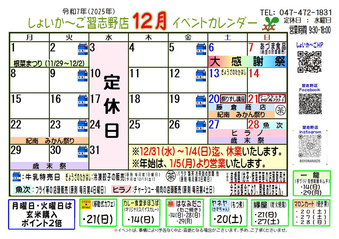 お待たせいたしました。12月のしょいか~ご習志野店情報です。