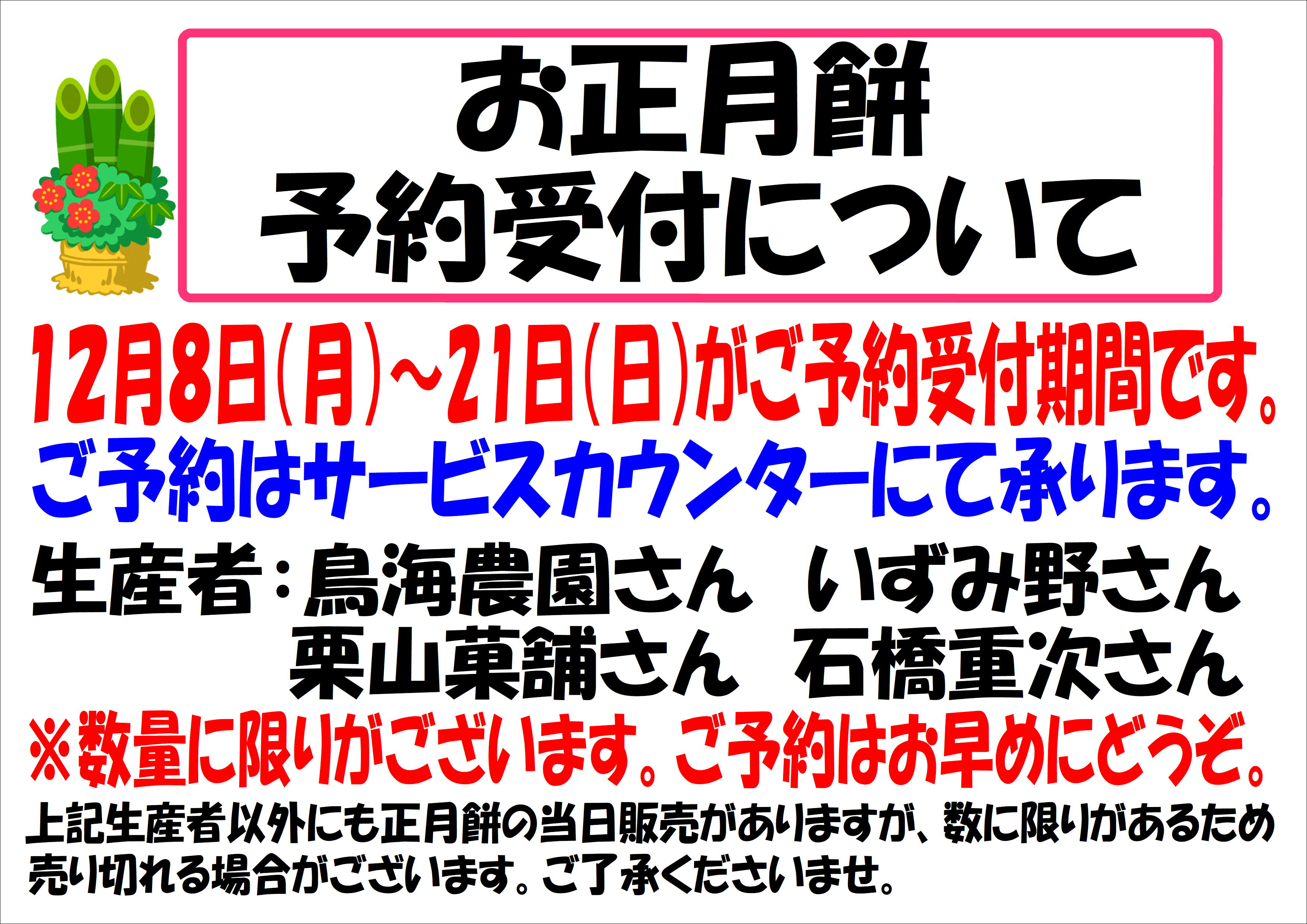 12月8日(月)~21日(日)がお正月餅のご予約承り期間です。