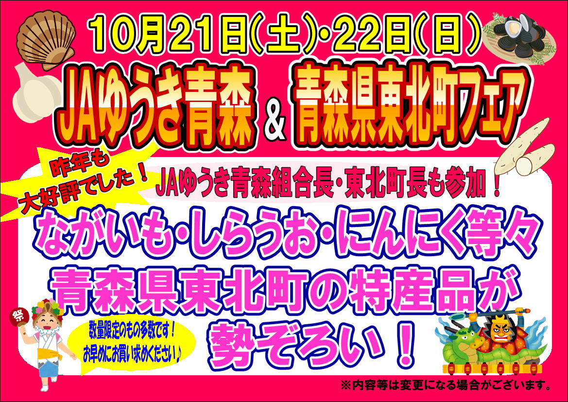 10月21日(土)・22日(日)にJAゆうき青森&青森県東北町フェアを開催いたします!