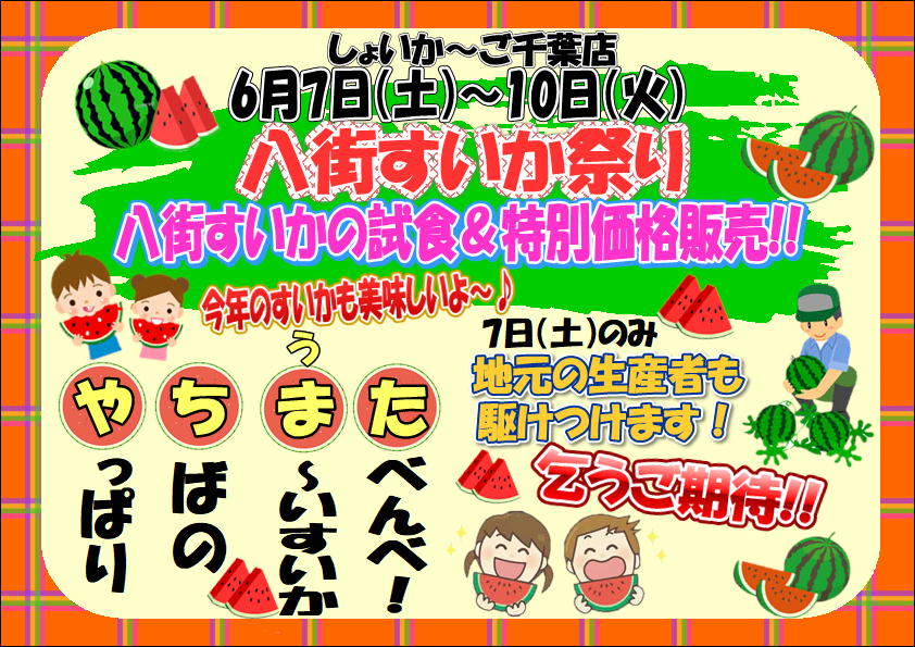5月31日(土)から開催を予定していました八街スイカまつりですが、6月7日(土)~10日(火)に延期となりました。