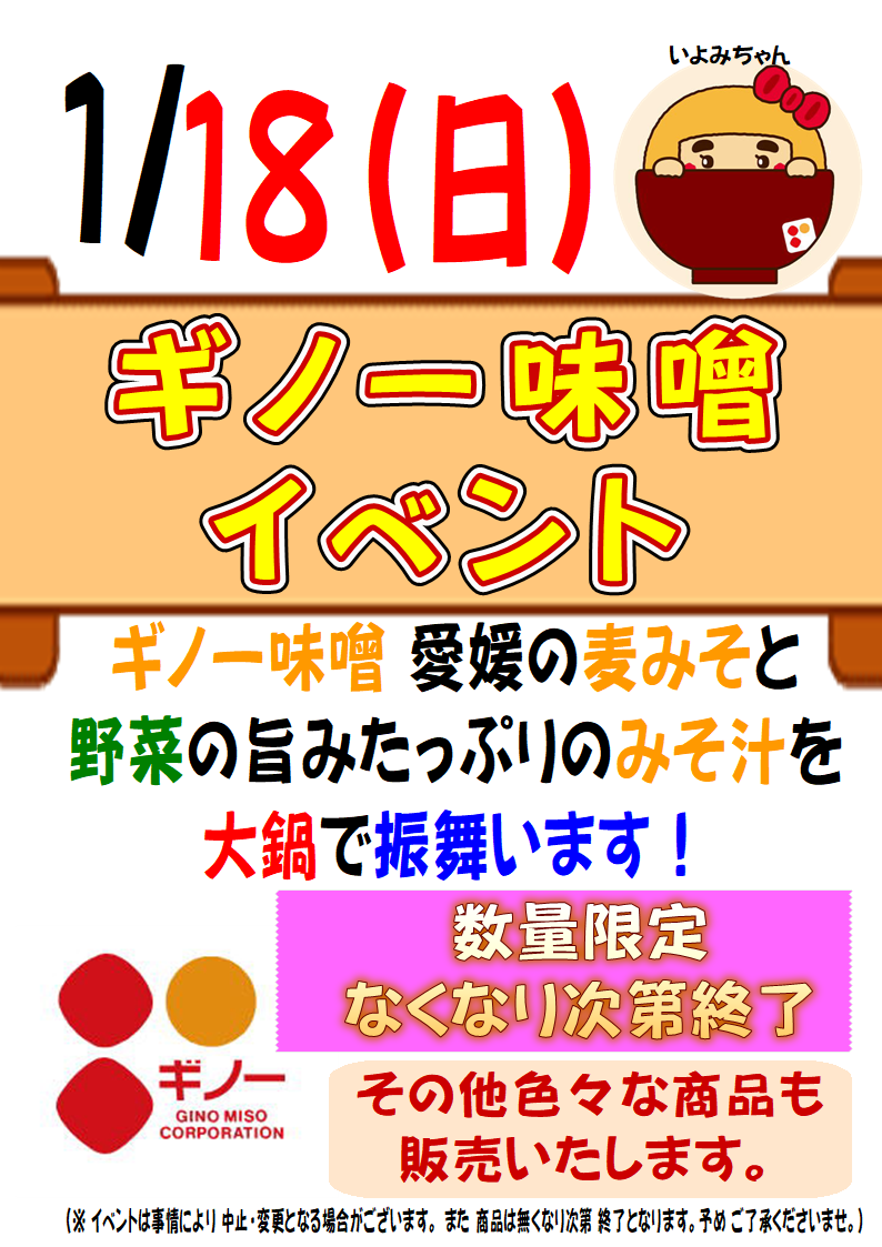 また1/18(日)には愛媛県の「ギノー味噌」さんによるみそ汁振る舞い(数量限定)、