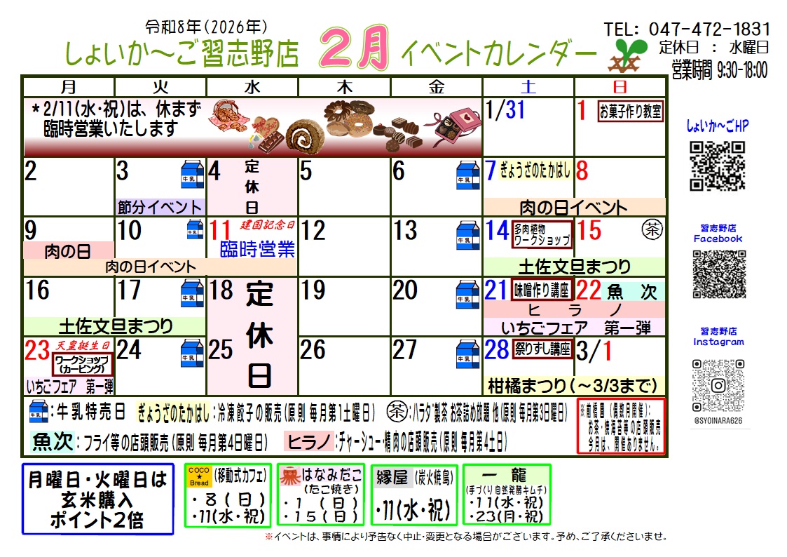 お待たせいたしました。2月のしょいか~ご習志野店情報です。