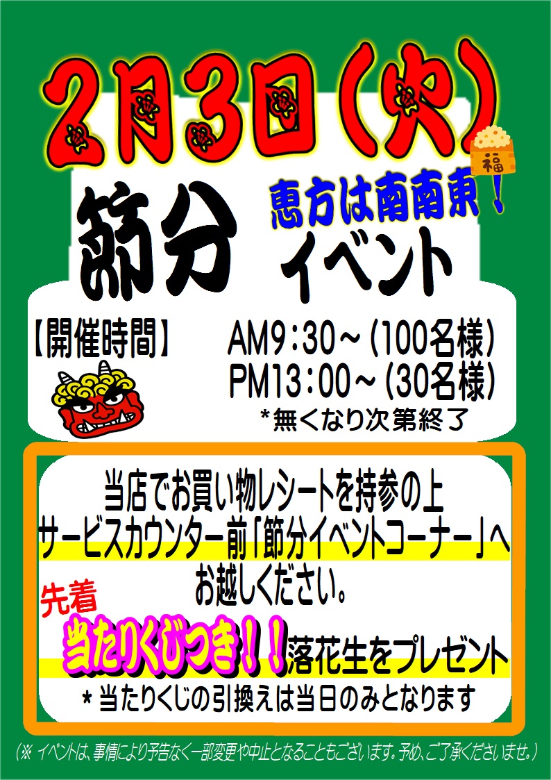 しょいか~ご習志野店では2/3(火)に「節分イベント」といたしまして