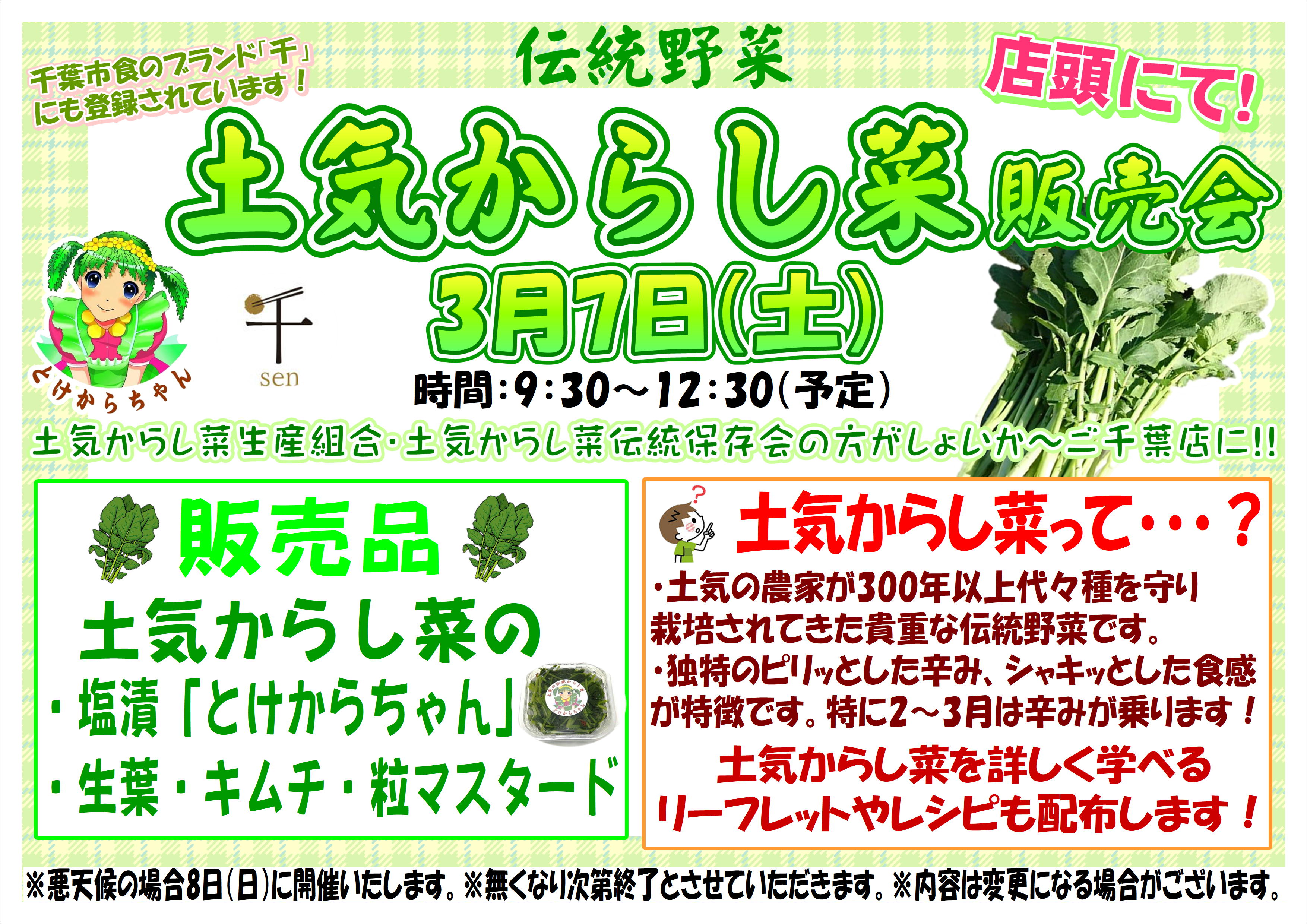 土気からし菜生産組合・土気からし菜伝統保存会の方がしょいか~ご千葉店にて対面販売を実施予定です。